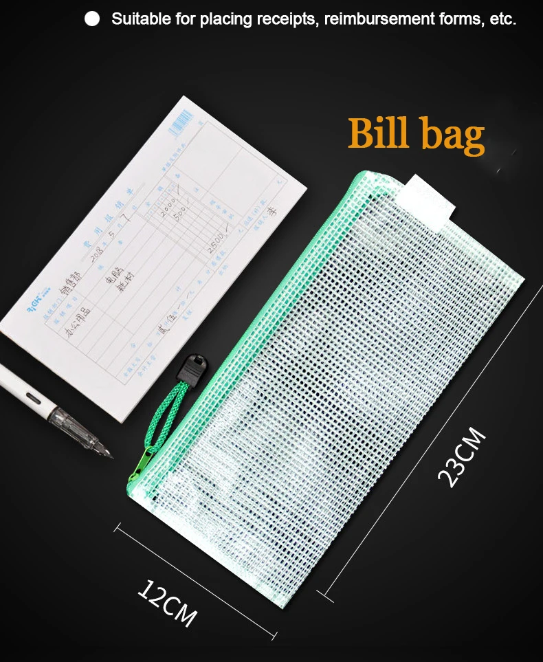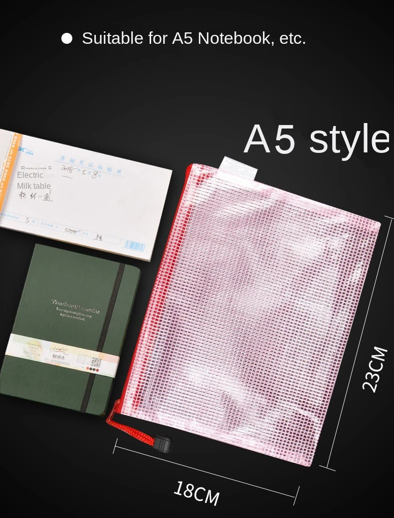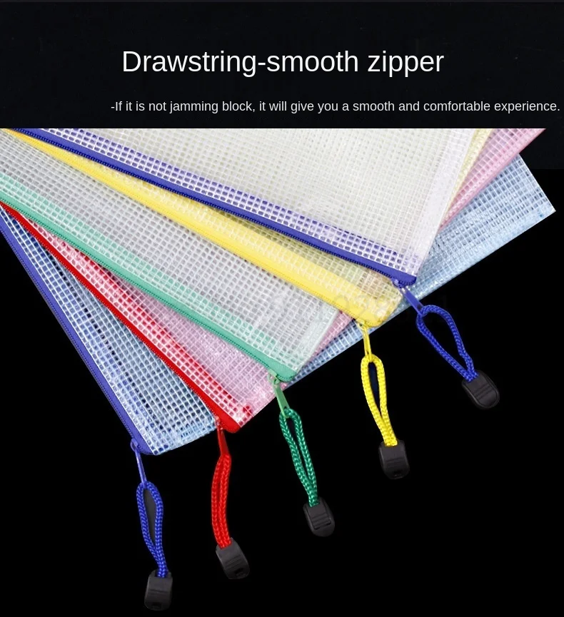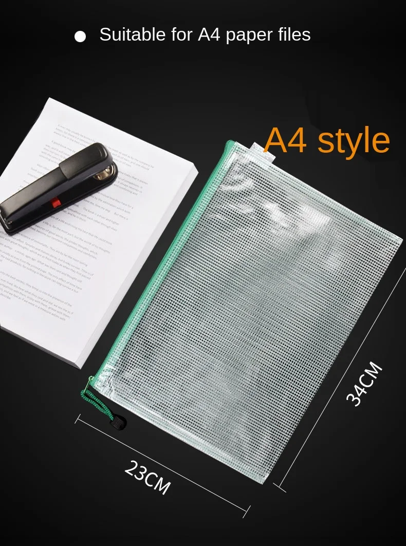 it is suitable for cutting and pasting documents, newspapers and magazines. It can be kept neatly without punching holes. The zipper bag has translucent design, and the opening adopts plastic zipper design, which can prevent the loss of items inside. The space inside is large. It can store all kinds of documents, materials and other learning and office supplies, and is suitable for learning, office and gift giving. Zipper net bag is made of high-quality environmental protection materials, and is made of A4 specification. The material has the characteristics of air permeability, wear resistance, high temperature resistance and corrosion resistance, which is suitable for schools, enterprises, units and other places.